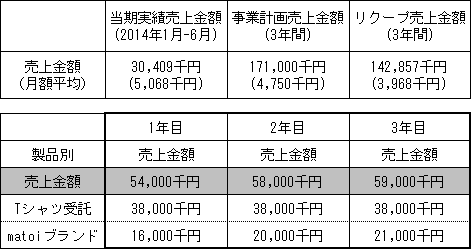 事業計画上の本匿名組合契約会計期間(3年間)の累計売上金額(税抜)は171,000千円(月平均売上金額4,750千円)であり、本匿名組合における累計リクープ売上金額(税抜)は142,857千円(月平均売上金額3,968千円)です。なお、営業者の前期(2013年1月~12月)の売上金額(税抜)は45,760千円(月平均売上金額3,813千円)、今期(2014年1月~6月)の売上金額は30,409千円(月平均売上金額5,068千円)の見込です。