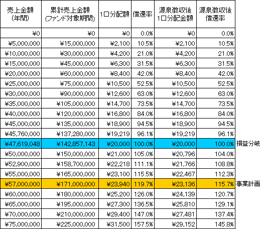 本匿名組合契約における金銭による分配金額のシミュレーションは以下のとおりです。なお、シミュレーションの目的は、本匿名組合事業の売上に応じた分配金額を予想することにあります。したがって、売上を保証するものではなく、匿名組合員に対し、分配金額を保証するものでもありません。
