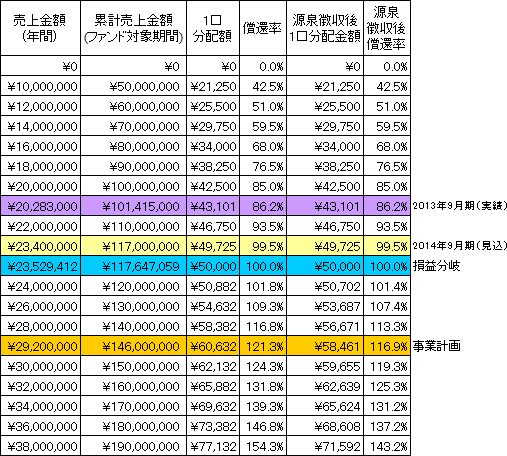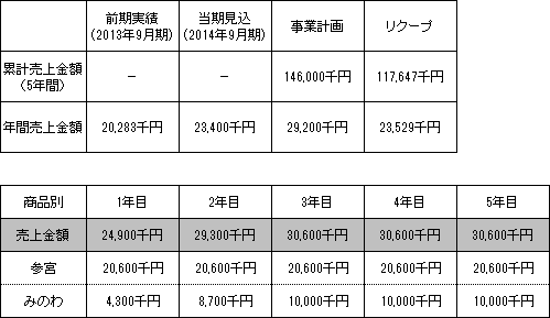 事業計画上の本匿名組合契約会計期間(5年間)の累計売上金額(税抜)は146,000千円(年平均売上金額29,200千円)であり、本匿名組合における累計リクープ売上金額(税抜)は117,647千円(年平均売上金額23,529千円)です。なお、営業者の前期(2013年9月期)の売上金額(税抜)は20,283千円(実績)、当期(2014年9月期)の売上金額(税抜)は23,400千円(見込)です。