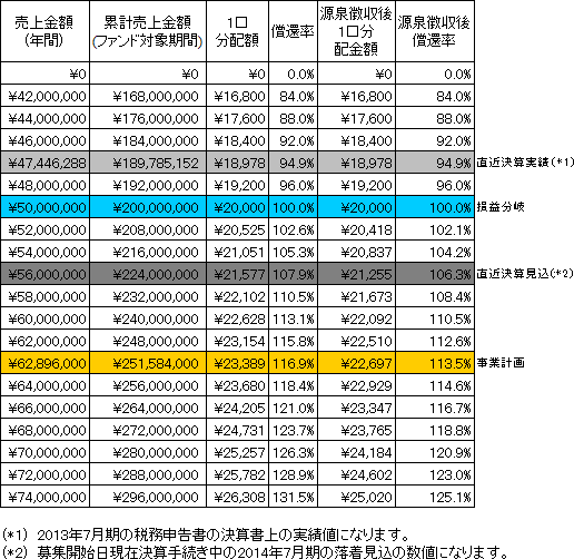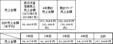事業計画上の本匿名組合契約会計期間(4年間)の累計売上金額(税抜)は251,584千円(年平均売上金額62,896千円)であり、本匿名組合における累計リクープ売上金額(税抜)は200,000千円(年平均売上金額50,000千円)です。なお、営業者の直近決算(2013年8月~2014年7月)の着地見込(募集開始日現在決算手続き中)の売上金額(税抜)は56,000千円です。