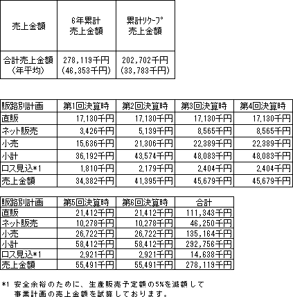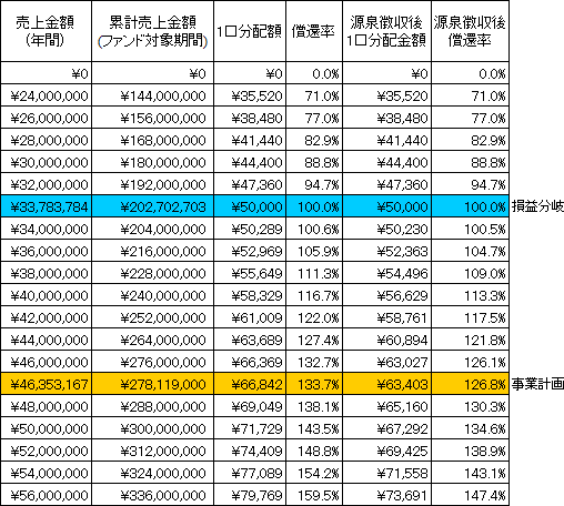事業計画上の本匿名組合の無分配期間を除く6年間の累計売上金額(税抜)は278,119千円(年平均売上金額46,353千円)であり、本匿名組合における累計リクープ売上金額(税抜)は202,702千円(年平均売上金額33,783千円)です。