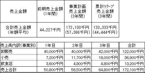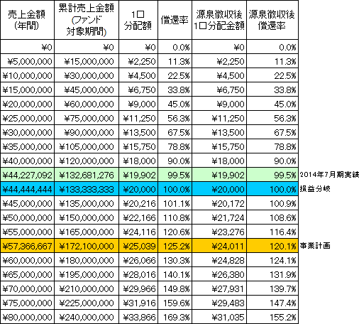 事業計画上の本匿名組合契約会計期間(2015年1月~2017年12月)の累計売上金額(税抜)は172,100千円(年平均売上金額57,366千円)であり、本匿名組合における累計リクープ売上金額(税抜)は133,333千円(年平均売上金額44,444千円)です。なお、営業者の前期(2013年8月~2014年7月)の売上金額(税抜)は44,227千円です。