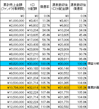 事業計画上の本匿名組合契約会計期間(1年間)の累計売上金額(税抜)は10,794千円であり、本匿名組合における累計リクープ売上金額(税抜)は8,820千円(年平均売上金額22,857千円)です。