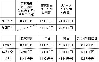 事業計画上の本匿名組合契約会計期間(2015年7月~2017年6月)の累計売上金額(税抜)は82,851千円(年平均売上金額41,425千円)であり、本匿名組合における累計リクープ売上金額(税抜)は41,086千円(年平均売上金額20,543千円)です。なお、営業者の前期(2013年11月~2014年10月)の売上金額(税抜)は18,481千円です。