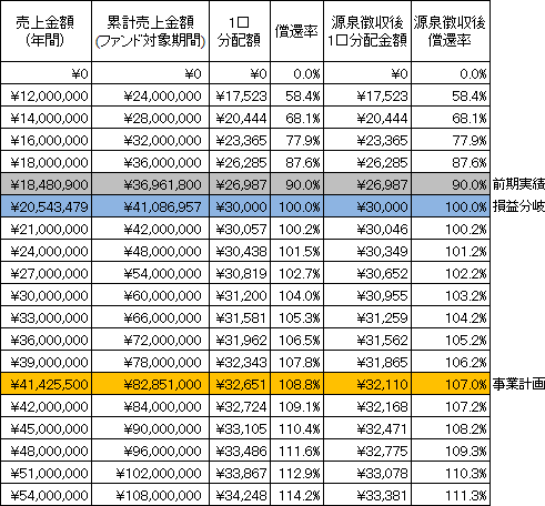 本匿名組合契約における金銭による分配金額のシミュレーションは以下のとおりです。なお、シミュレーションの目的は、本匿名組合事業の売上に応じた分配金額を予想することにあります。したがって、売上を保証するものではなく、匿名組合員に対し、分配金額を保証するものでもありません。