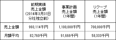 事業計画上の本匿名組合契約会計期間(1年間:2015年4月~2016年3月)の累計売上金額(税抜)は1,100,000千円であり、本匿名組合契約における累計リクープ売上金額(税抜)は700,000千円です。なお、営業者が分社独立する以前(2013年4月~2014年3月)の本匿名組事業の売上金額(税抜)は993,114千円です。