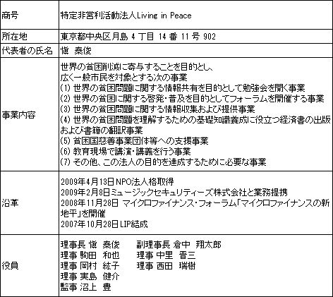 | 【営業者】 本匿名組合の事業を行う営業者の概要は、次のとおりです。(2014年12月19日現在) ![]() 【取扱者】 本匿名組合契約の出資募集および契約締結の取扱い、本匿名組合契約の管理運営、匿名組合員へのIR業務等を委託する会社の概要は、次のとおりです。(2014年12月19日現在) ![]() 【取扱者】 (1) 特定非営利活動法人Living in Peace (LIP) 本匿名組合契約の営業者の広報や財務状況のモニタリングおよびアナリストレポートの作成、並びに投資家特典の企画・実施等を委託する協力者であるLIPの概要は、次のとおりです(2014年12月19日現在)。 ![]() (2) CARD NGO (Center for Agriculture and Rural Development, Inc.) 営業者への役員やスタッフの派遣、技術支援、出資等の資金援助により、営業者の経営をサポートするとともに、取扱者及びLIPへの営業者に関する情報の提供や緊急時における現地連絡窓口を担う協力者であるCARD NGOの概要は、次のとおりです(2014年12月19日現在)。 ![]() |