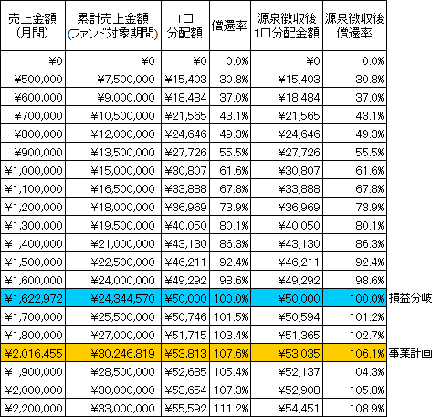 本匿名組合契約における金銭による分配金額のシミュレーションは以下のとおりです。なお、シミュレーションの目的は、本匿名組合事業の売上に応じた分配金額を予想することにあります。したがって、売上を保証するものではなく、匿名組合員に対し、分配金額を保証するものでもありません。