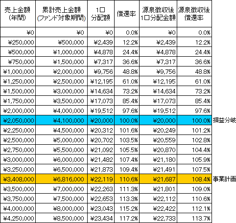 本匿名組合契約における金銭による分配金額のシミュレーションは以下のとおりです。なお、シミュレーションの目的は、本匿名組合事業の売上に応じた分配金額を予想することにあります。したがって、売上を保証するものではなく、匿名組合員に対し、分配金額を保証するものでもありません。