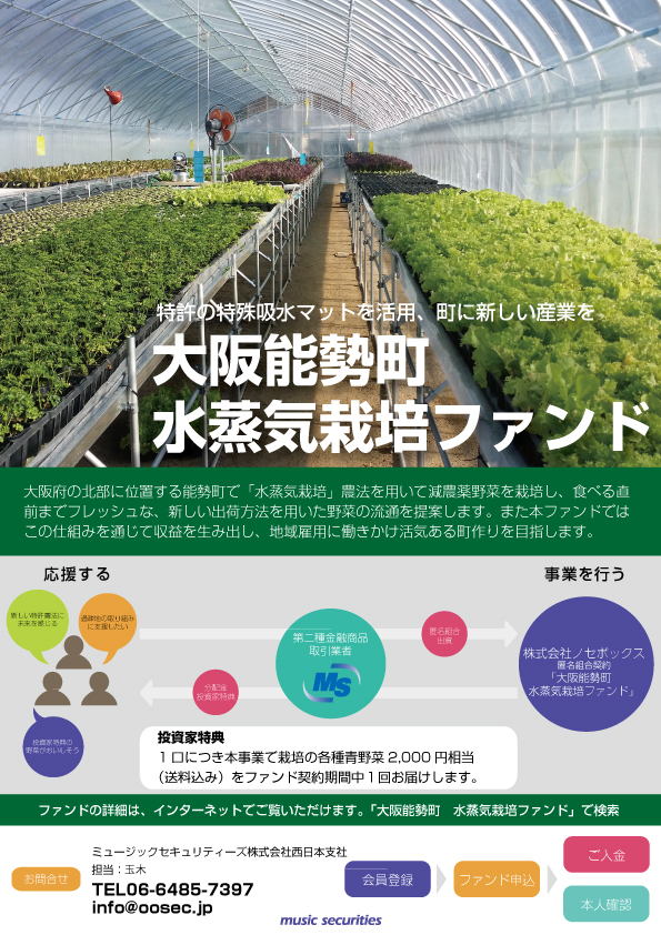 | 本匿名組合契約名称 | 大阪能勢町 水蒸気栽培ファンド | |||