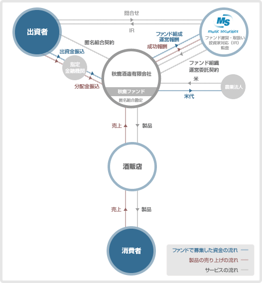 また、本匿名組合契約に基づく利益の分配又は匿名組合出資金の返還は、専ら営業者の当該事業による収入をその原資とします。従って営業の成果(本件日本酒の売上状況)によっては利益の分配が行われない可能性があり、契約終了時の匿名組合出資金の返還額は出資時と比較して減少する可能性があります。