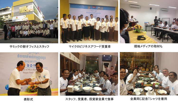 2012年12月8日、カンボジアプノンペンにある、サミックの新オフィスにてマイクロビジネスアワードの式典を開催しました。 サミックとセイラニティから役員・職員の方々や、マイクロビジネスアワードにノミネートされた20名の顧客が集まり、表彰状や商品の授与、記念撮影を行いました。商品は、それぞれのニーズに合わせ、発電機やポンプを贈呈しました。現地のテレビ取材も入り、盛大な式典となりました。