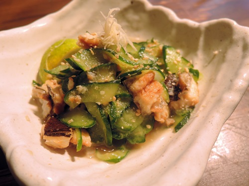 「うざく」とはかば焼きにしたうなぎを細かく切り、薄く刻んでもんだきゅうりと三杯酢であえた料理のことで、うなぎの代わりに「あなご」をあえられました。