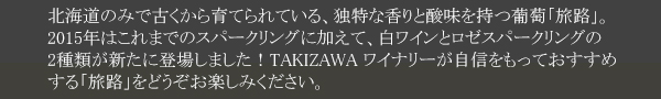 北海道のみで古くから育てられている生食用葡萄「旅路」の味わいを野生酵母でゆっくりと引き出した手仕込みのスパークリングワインです。「旅路」ならではの香りと酸味を持ったオリジナルな味わいをお楽しみ下さい。 |