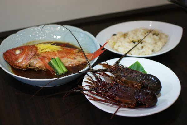 金目鯛の姿煮(1匹)、活き伊勢海老 (2匹)、サザエの炊き込みご飯(2合分4人前)