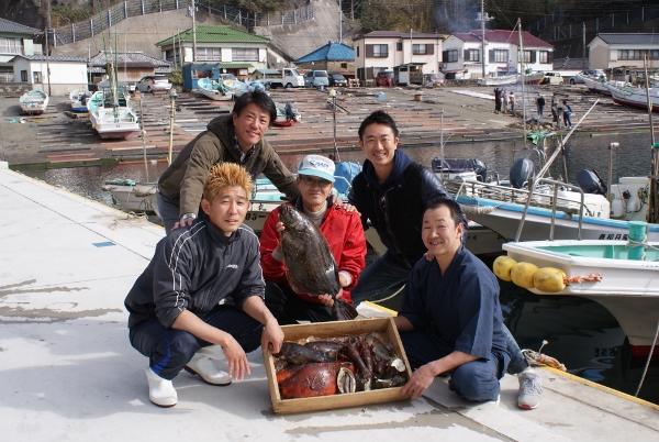 1列目左から1番目、2番目が下田の漁師。一番右が小川料理長、右から2番目が橋村社長、