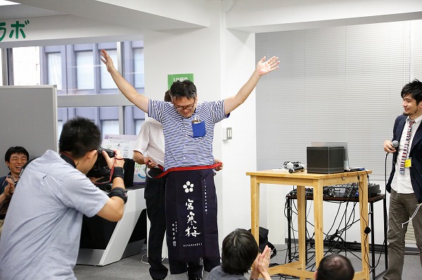 抽選会では岩﨑代表自ら前掛けを結ぶサプライズも