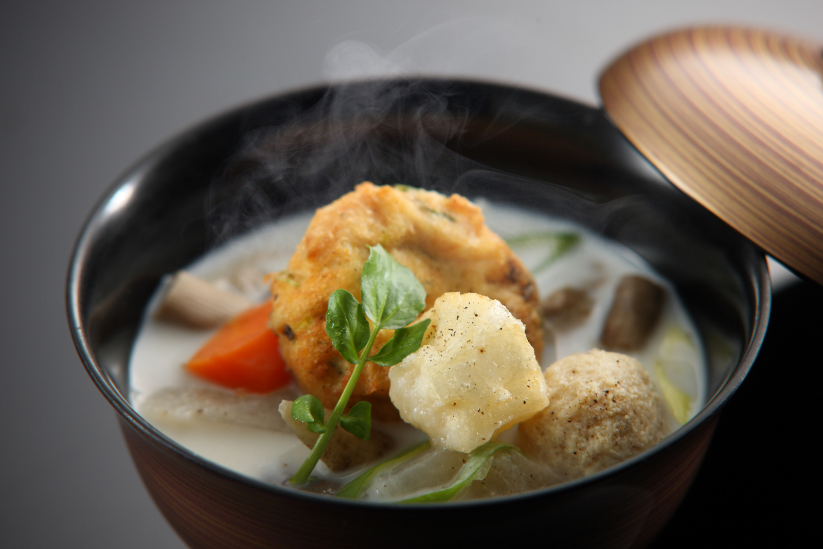 真っ白な豆乳をベースに大きめに切ったたっぷりの冬野菜と飛龍頭(ひりゅうず)を煮込んだ、一見、本当にシンプルなお鍋です。 が、一口食べれば心からふんわりと温かな気分になります。