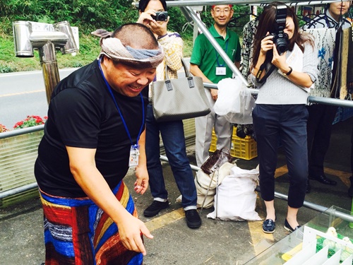 カンボジアの民族衣装に身を包み、恒例のひよこレースの実況を行っておられます。