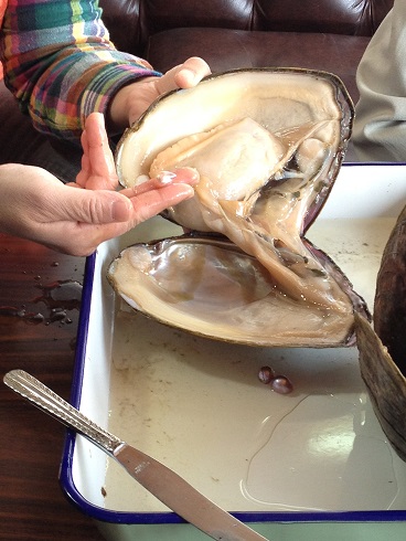 はい、こちらが、まさに母貝から琵琶パールを取り出しているところです。