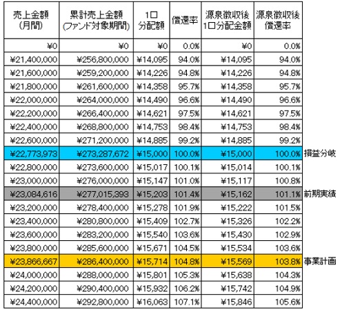 こちらは前期実績相当で売上が推移できれば、投資家の皆様には出資金元金分はお戻しすることができる損益分岐点の設定となっています。