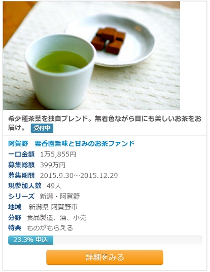 投資家特典として、1口15,000円あたり、3,500円相当(出資金の23%相当額)の人気のブレンド茶葉「越後路」と「玉露入りお茶屋さんのあごだし」をお届けします。