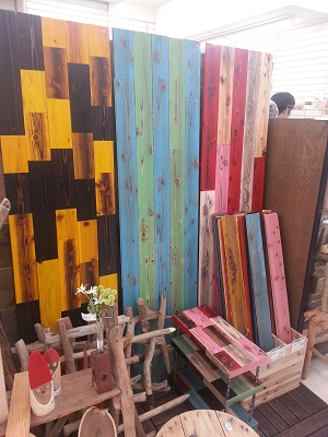 天竜材の丸太をカットして、その上に様々な商品を展示していきました。杉プラスのPRとして大きくパネルも作成し、華やかなブースとなりました。また午後3時半より、金原理事長の講演も短いありました。