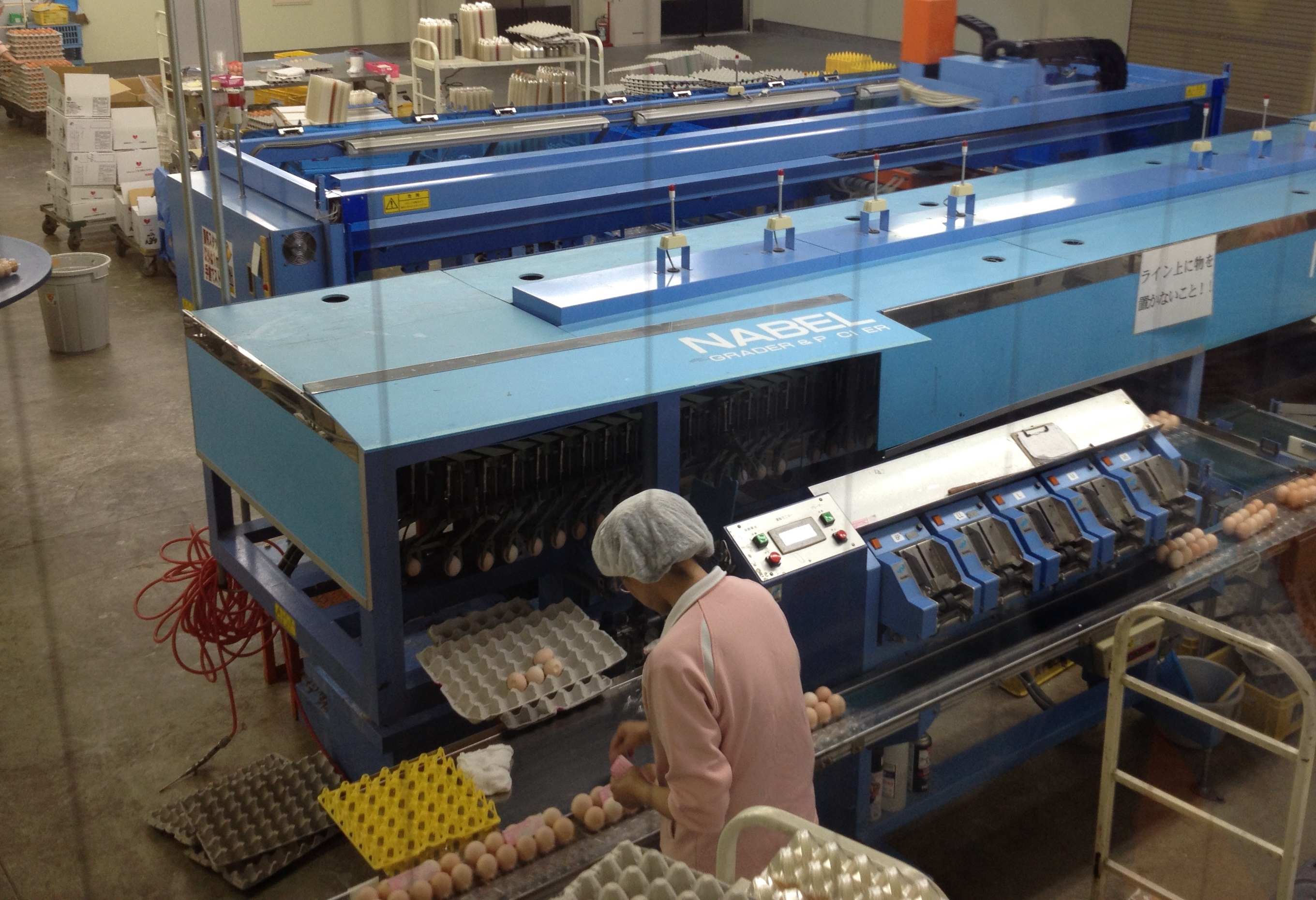まずは鶏舎の見学。(左写真)全ての鶏舎がベルトコンベアーで繋がっており、1日に約6万個のたまごがGPセンターへ集約されます。(右写真)