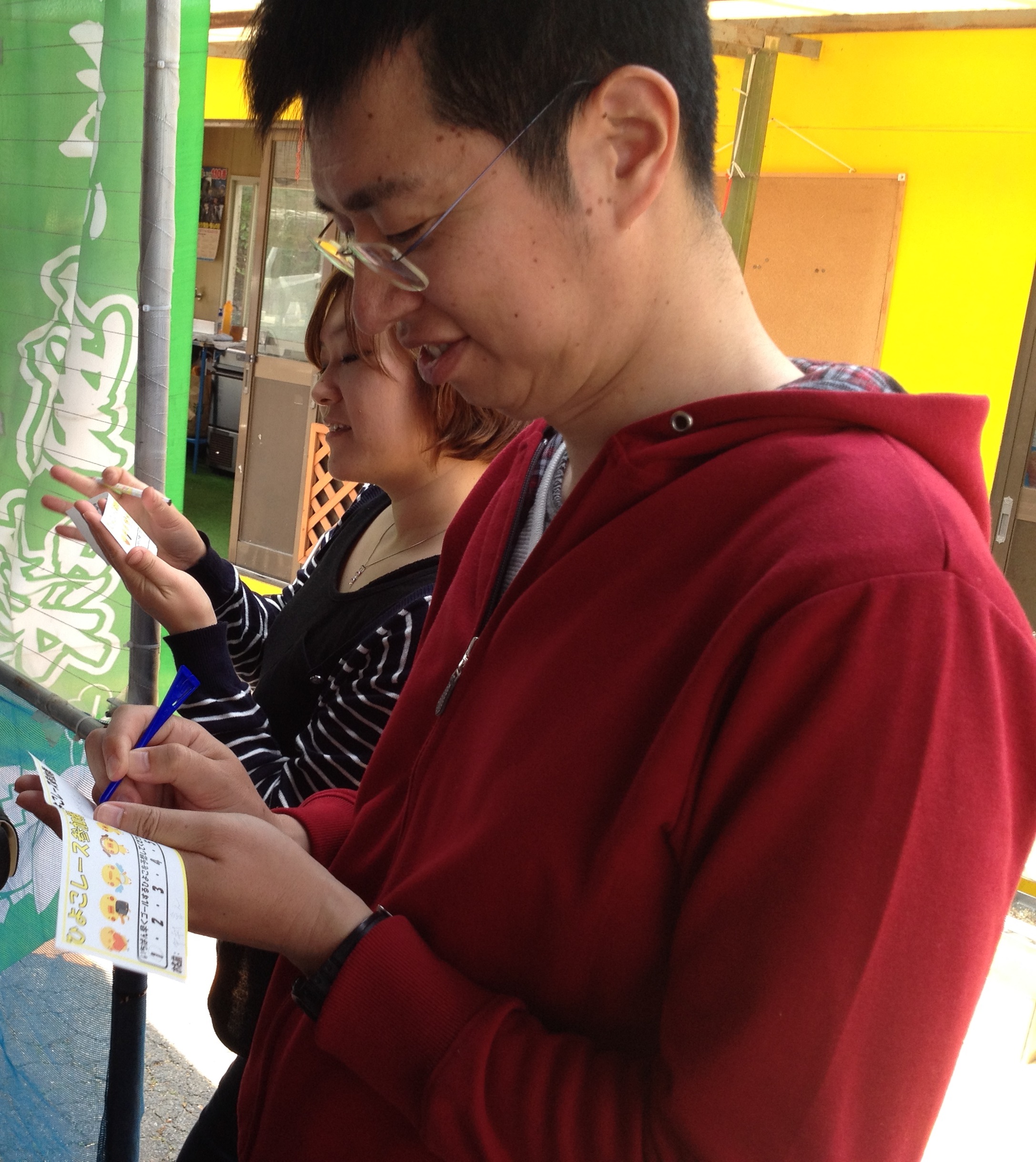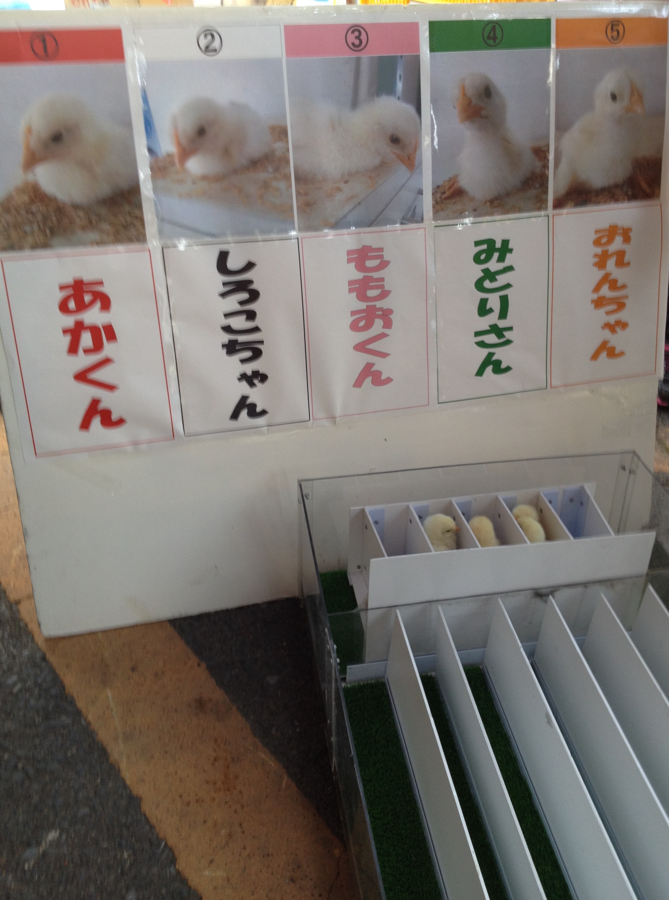 場所を移して、いよいよこの日のメインイベント。ひよこレースの開始です。事前に予想投票を行い、見事1位を当てた方には直売所で使える割引券がもらえるとあって大人も真剣(右写真)。1番人気は2番のしろこちゃん。さあ結果は?