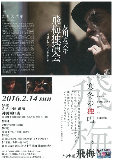 さて、当社ファンドをご利用されてオープンしましたかき小屋飛梅 神田西口店では2月14日に「友川カズキ 飛梅独演会 神田ワンマンライブ2016」を開催いたします。ご多用とは存じますが、どうぞ、ご参加いただけましたら幸いです。