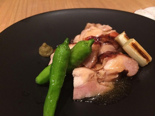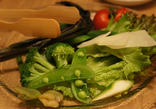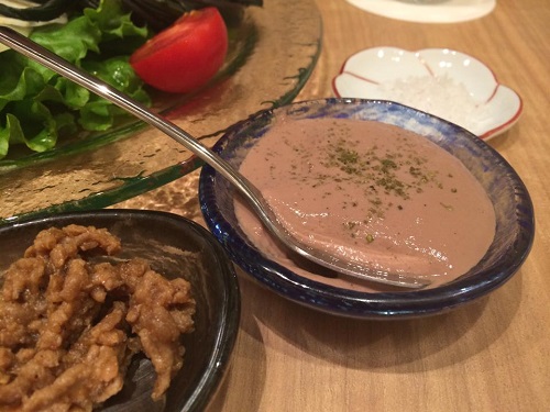 「えんどう豆」や「赤ほうれん草」など、大山の地野菜を「肉みそ」と「レバーペースト」で頂きました。採れたての新鮮野菜はシャキシャキで、それだけで頂いても美味しいのですが、濃厚の「レバーペースト」で頂くと、なお美味しく、野菜でお酒が進みました。
