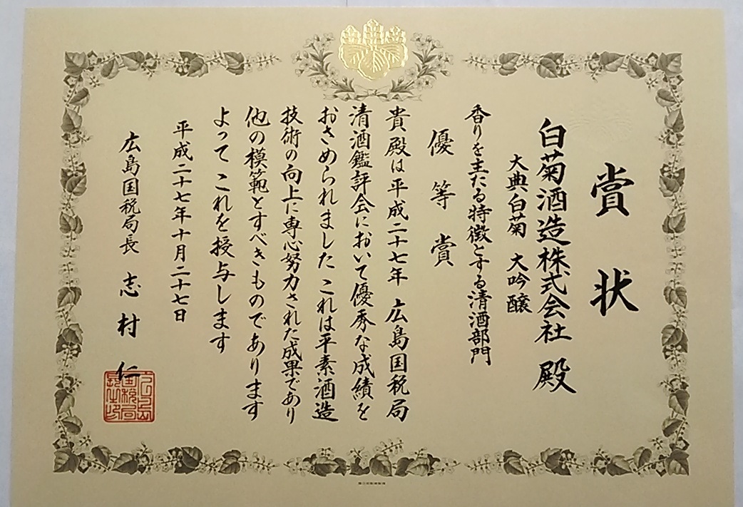 先日開催されました「平成27年広島国税局清酒鑑評会」において、当蔵が2部門で優等賞(金賞)を受賞しました!