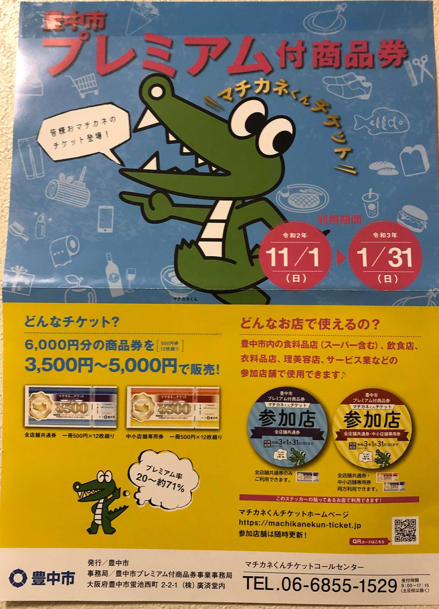 市民の消費を喚起することにより、新型コロナウイルス感染症の影響を受けた市内事業者を応援するとともに、市民の家計への支援を目的に、市内参加店舗等で使用できるプレミアム付商品券「マチカネくんチケット」を発行します。当事業では、規模を問わず登録された全店舗で利用できる「全店舗共通券」10万冊と、中小店舗のみで利用できる「中小店舗専用券」5万冊(それぞれ一冊あたり6,000円利用可)を合わせて15万冊・総額9億円のマチカネくんチケットを、令和2年(2020年) 11月1日から利用開始とし、消費者に広く豊中市内の事業者様を利用していただき、市内の消費を拡大していこうというものです。