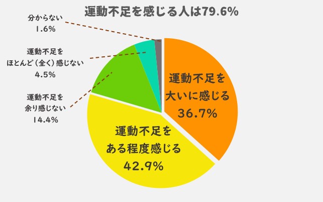 スポーツ庁が毎年行っている「スポーツの実施状況等に関する世論調査」によると、「運動不足を感じるか」の問いに「大いに感じる・ある程度感じる」と回答した人は、2020年には79.6%と増加しています。