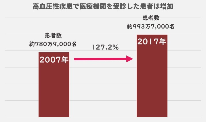 2008年に高血圧性疾患で医療機関を受診した患者は約796万7,000名でしたが、2017年には約993万7,000名にまで増加しました。