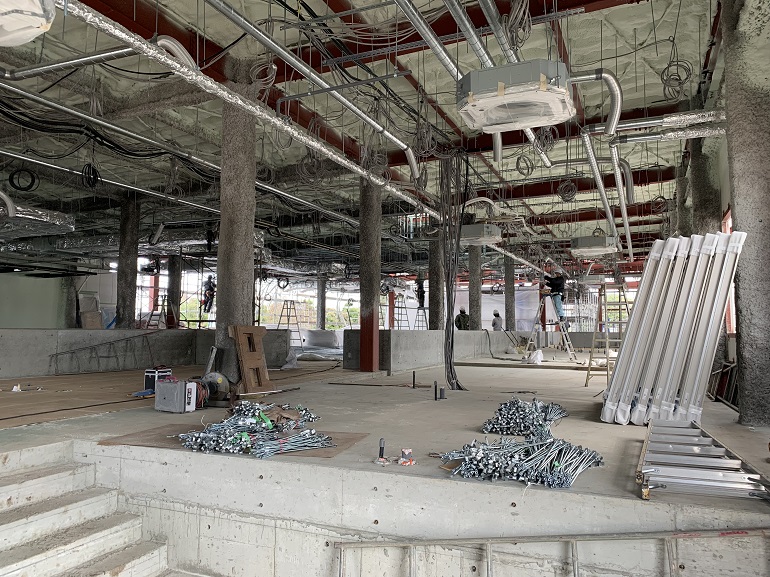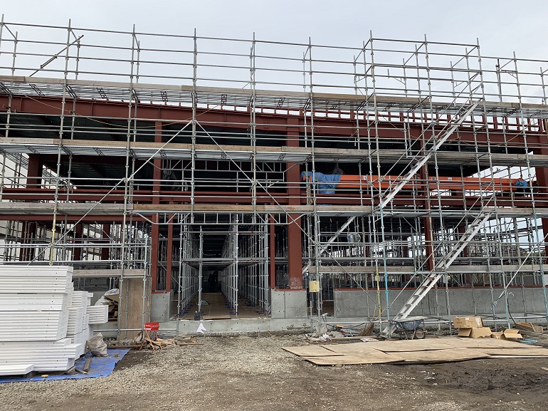 上の写真は、12月中旬に撮影したものです。この頃は、鉄骨が組みあがり、外壁と内装をメインに業者の方が工事していました。