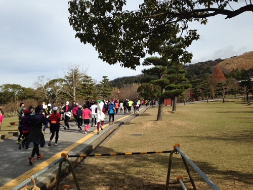 一月後には山焼きが行なわれる若草山を右手に、10kmコースを走るランナー。