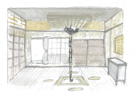 一棟を三部屋に割ります。 まず、一の間。囲炉裏を囲める土間、板間です。