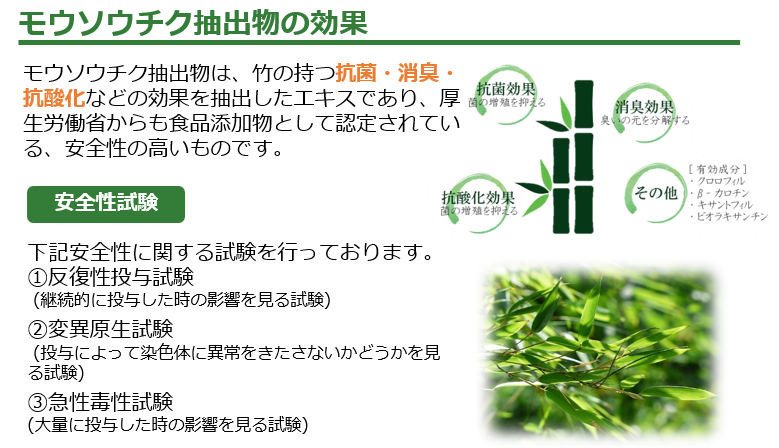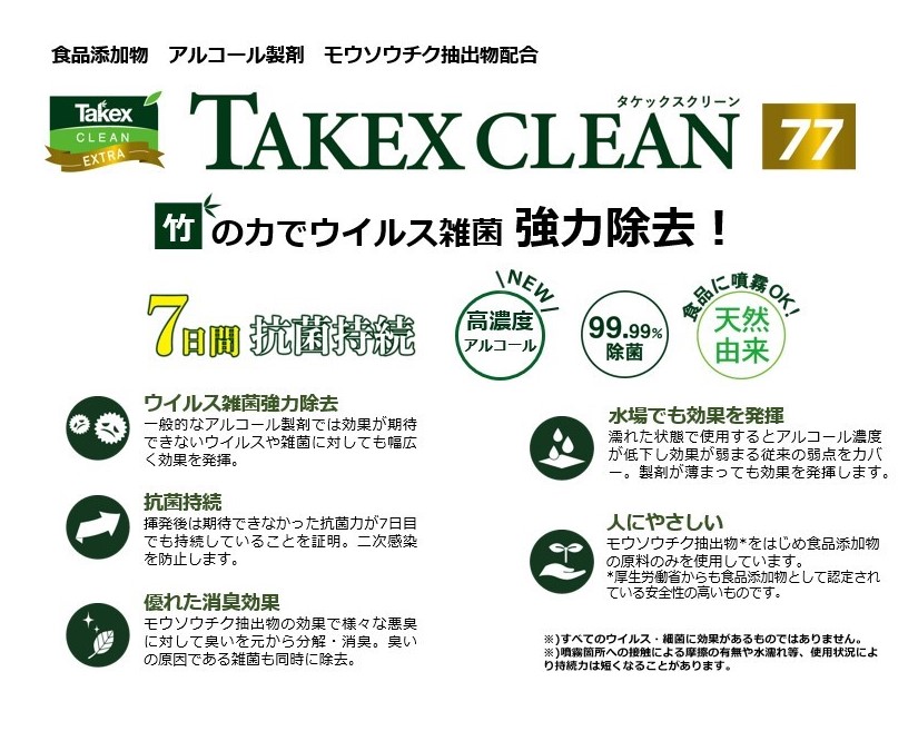 タケックスクリーン 77はモウソウチクという竹の成分を抽出したエキス、モウソウチク抽出物を配合した食品添加物アルコール製剤です。