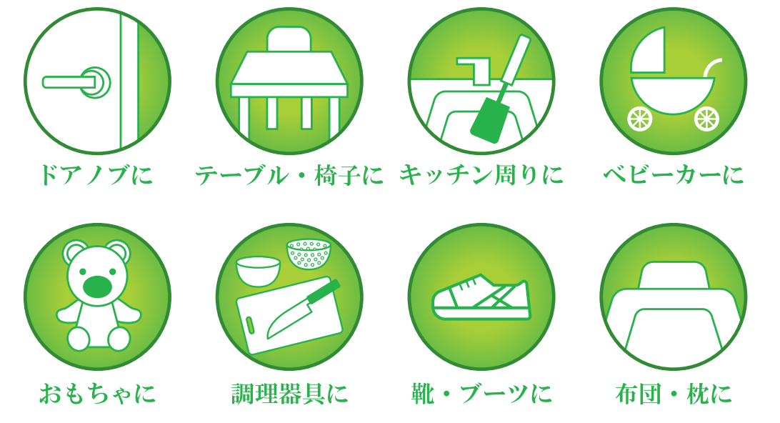 ドアノブ、テーブル・椅子など手がよく触れるところ、