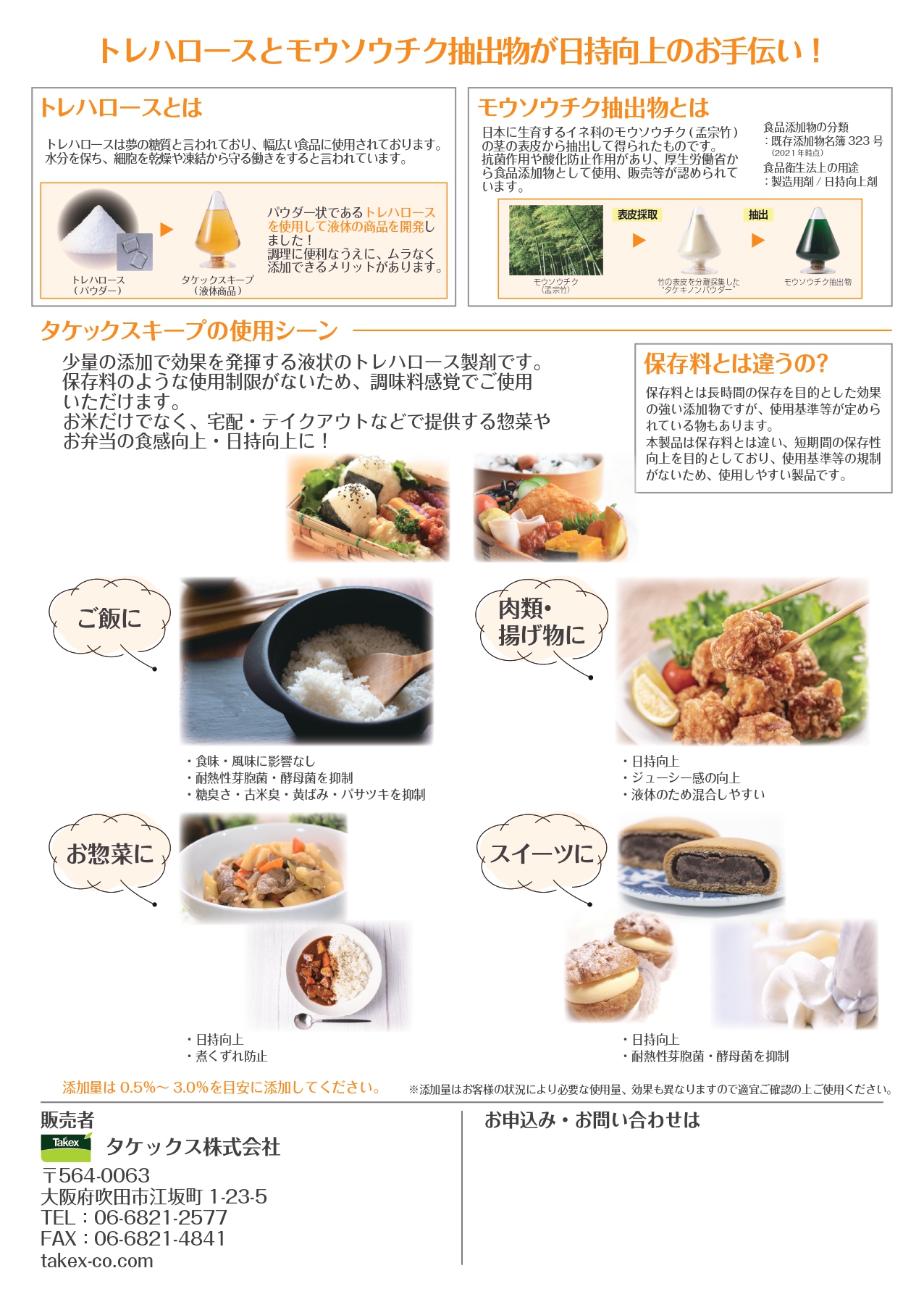 タケックスキープには「トレハロース」と「モウソウチク抽出物」を配合しており、液体化されたトレハロース製剤のため、幅広い食品に添加可能で混合しやすい商品です。