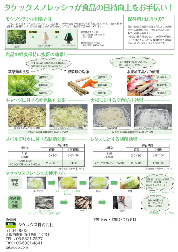 今回は、日持向上効果が期待できるタケックスフレッシュをご紹介いたします。