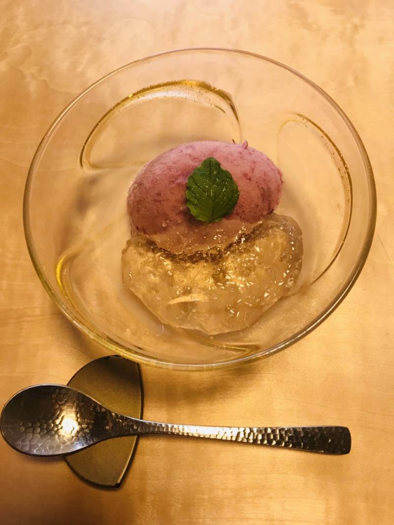 (ブドウのシャーベットと白ワインゼリー)が