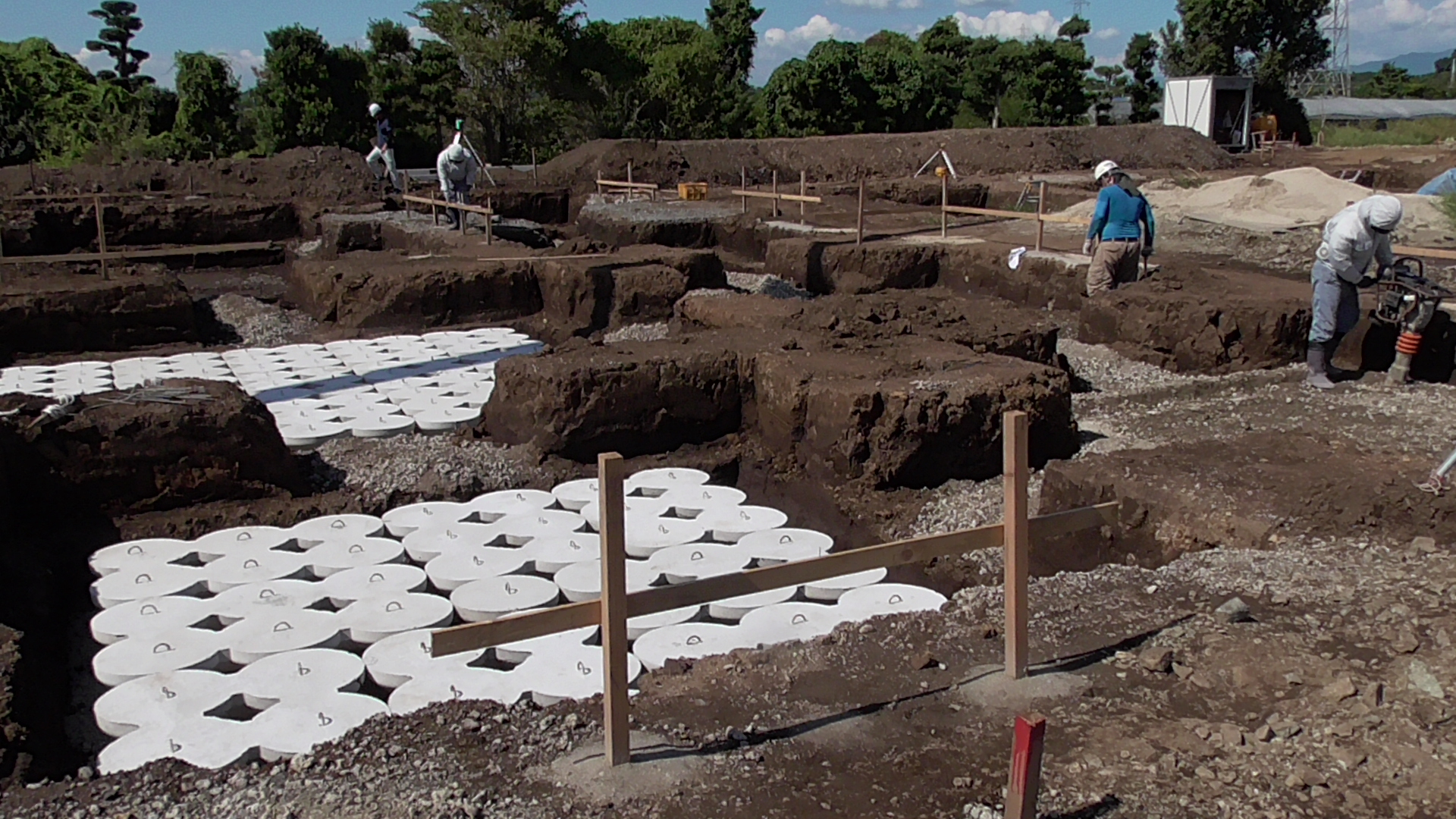 現場の様子。地盤改良(建築物などを地盤上に建築するにあたり、安全性を保つために人工的な改良を加えること)をしているところです。