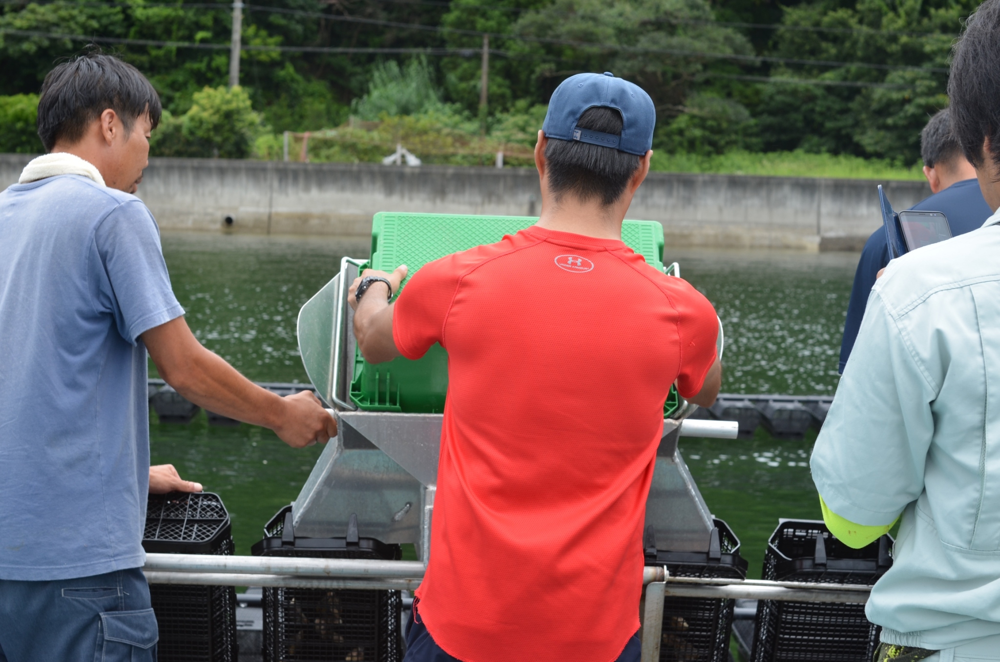 手作業で2年間、天日干しを繰り返していましたが、手作業での天日干しは大変だな・・・と感じていた当時、奇跡的にニュージーランドで私と同じ考え方の牡蠣養殖をしている生産者のことを知りました。その生産者は牡蠣養殖は重労働であり、従業員が辞めることが多いので、もっと楽に生産できるシステムを開発したいと考え、効率的な牡蠣養殖を機械化によって実現した人でした。
