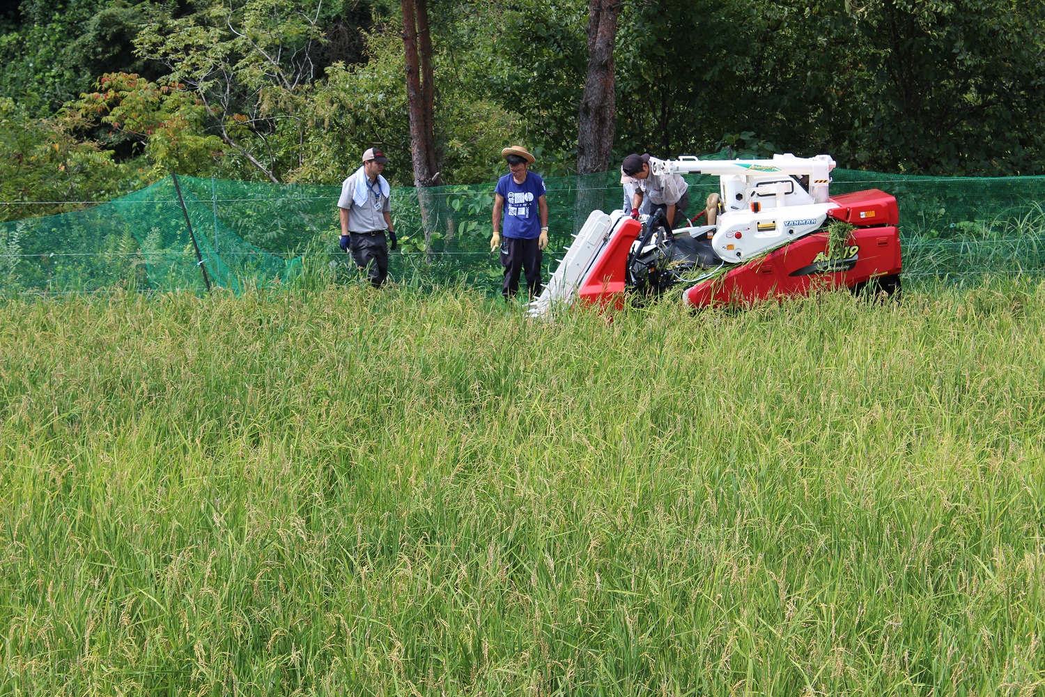 しまいます。コンバイン(上の機械)で刈り取る際に、雑草も巻き込んで