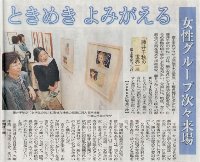 藤井千秋は岐阜県で生まれ、京都で育った。終戦後間もなく雑誌「少女の友」にカットを発表すると、瞬く間に人気を集め、挿絵画家の地位を確立。当時、女性誌に掲載された美人画は「抒情(じょじょう)画」と呼ばれ、千秋は戦後を代表する抒情画家として活躍した。(北日本新聞社より)