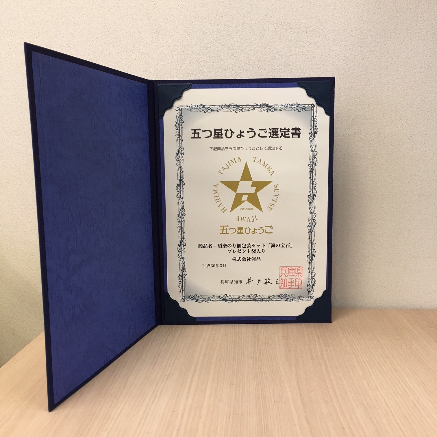 (五つ星ひょうごとは・・・ひょうご五国(摂津・播磨・但馬・丹波・淡路)の豊かな自然や歴史・文化を生かした商品のうち、“地域らしさ”に加えて、これまでにない新規性やオリジナリティなどの“創意工夫”が施された逸品を、統一ブランド名「五つ星ひょうご」として全国に発信するものです)