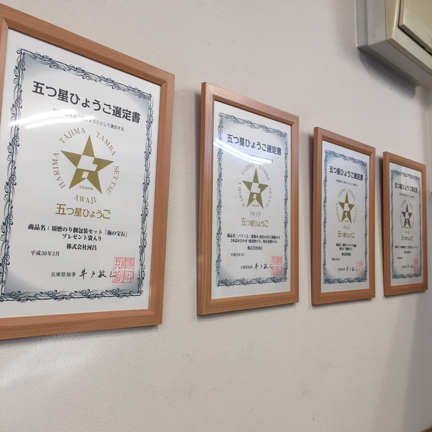 認定書を頂きましたので、去年までの物と一緒に壁にかけました。