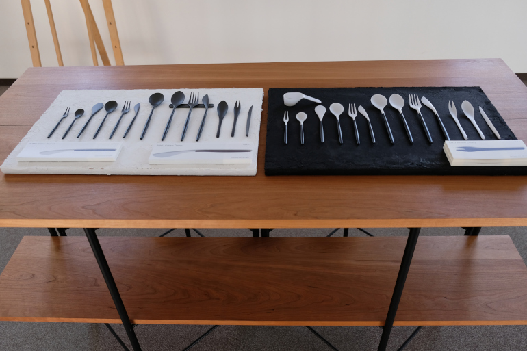 黒い台の上で白いカトラリーが映えます。黒い柄も、質感の違いで埋もれる事がありません。